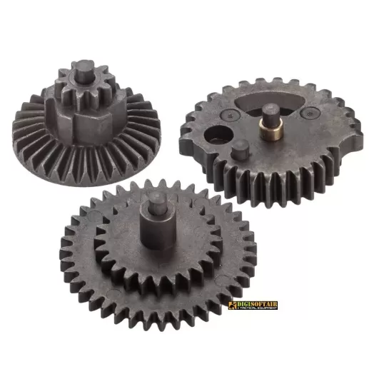 Terna di ingranaggi in acciaio con rapporto di 13:1 realizzati tramite processo MIM (Metal Injection Molding). Questo particolare procedimento permette di ottenere un risultato equiparabile al 99 % della resistenza del metallo lavorato dal pieno con tolleranze di + / - 0.01 millimetri. I nostri ingranaggi sono trattati termicamente e sono ad un trattamento di finitura superficiale che ne aumenta la durata e ne aumenta l'attrito durante il funzionamento.