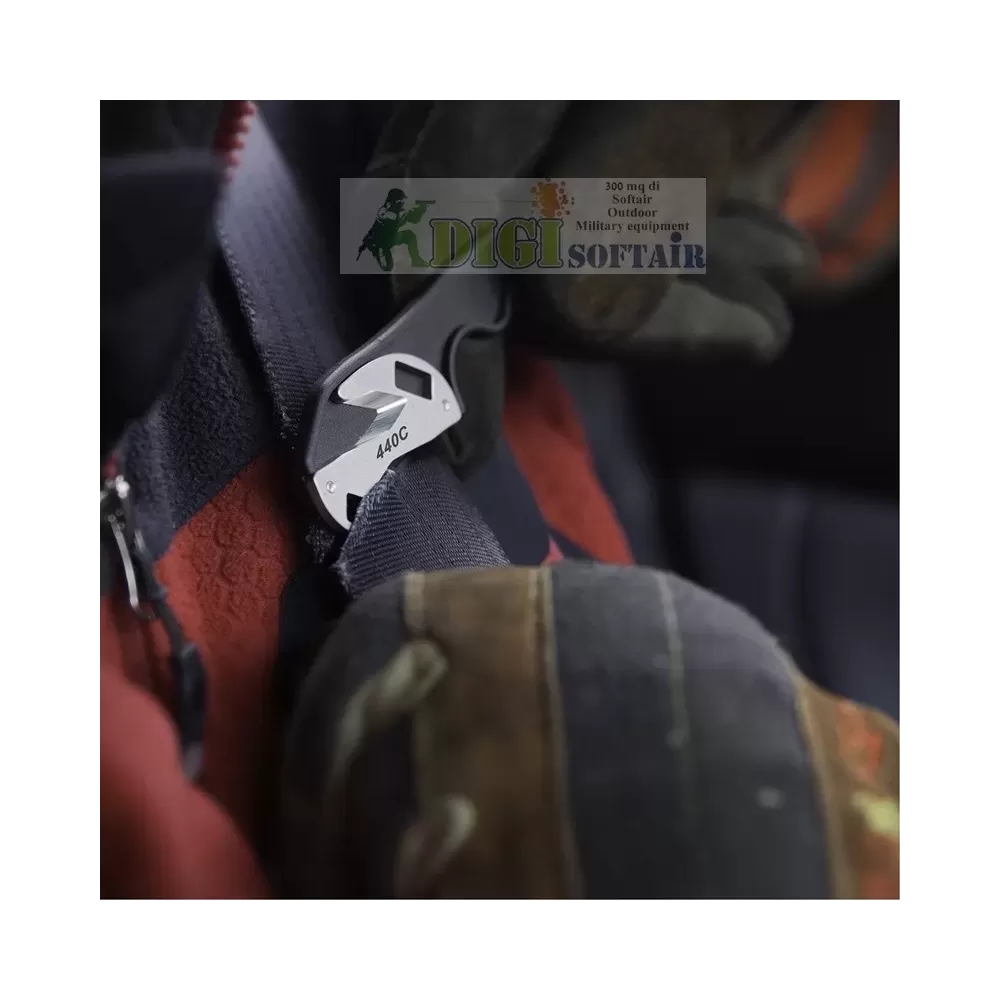 - Una fresa v-notch reversibile e sostituibile in acciaio inox 440C, ideale per il taglio di cinghie, cinture di sicurezza, tela e altri materiali duri.
