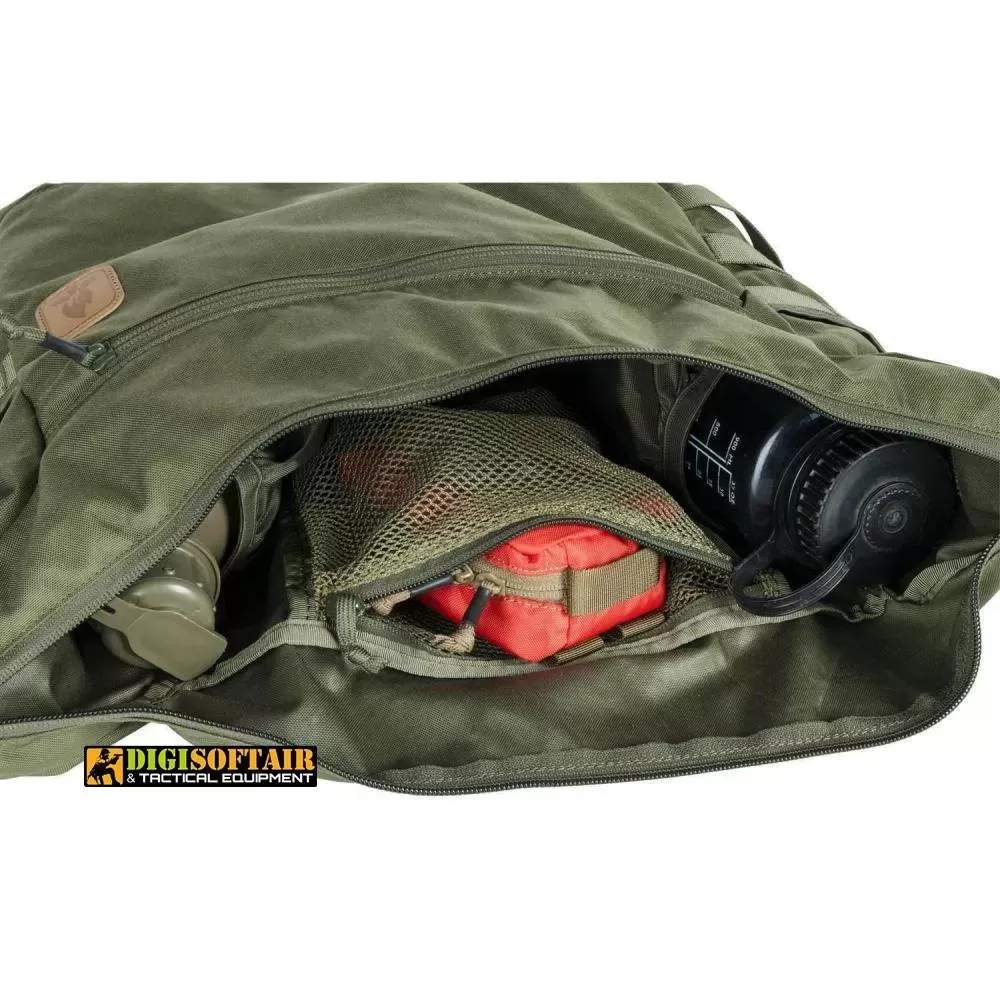 La camera principale comprende una tasca in rete con cerniera per oggetti di valore più due tasche elastiche con coulisse, ad es. portaborraccia. All'esterno la borsa ha una grande tasca con cerniera e due tasche aperte. I pannelli MOLLE / PALS sui lati e sui passanti inferiori consentono di attaccare sacchetti e oggetti aggiuntivi. Le cinghie di compressione consentono la regolazione della taglia.