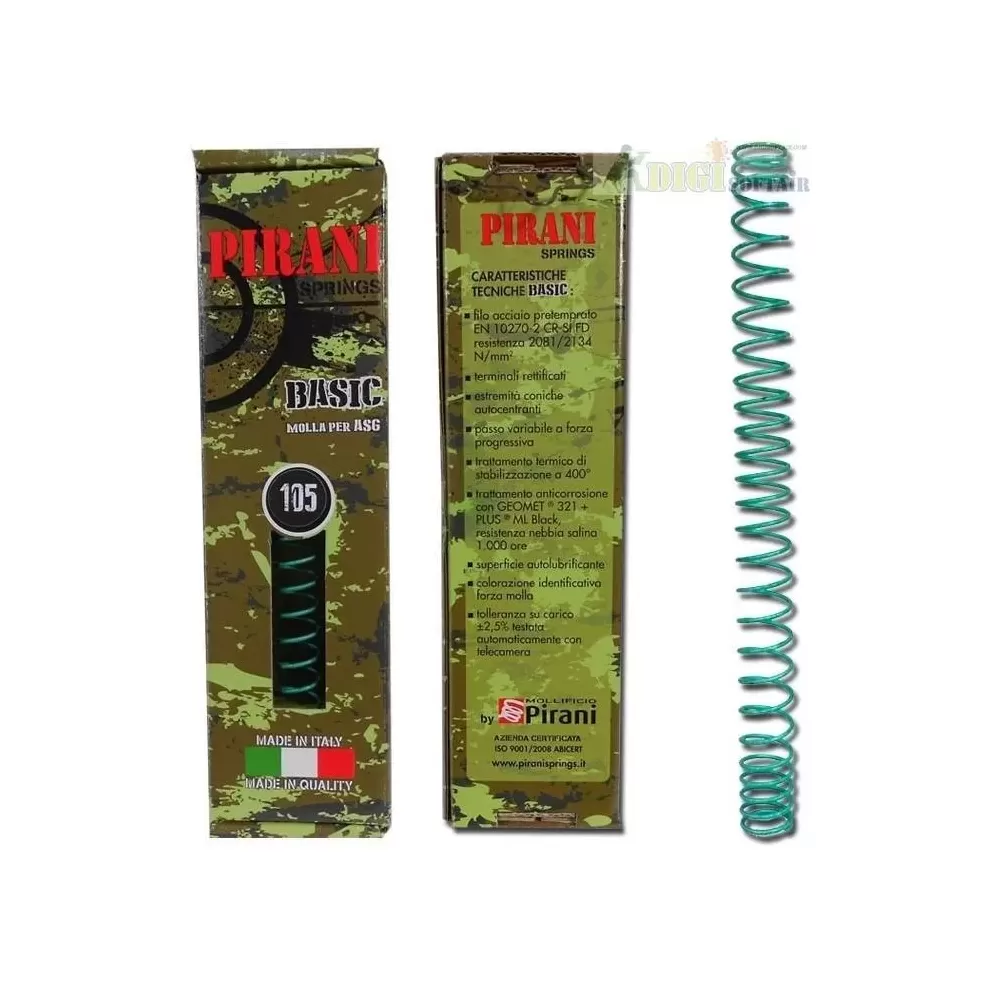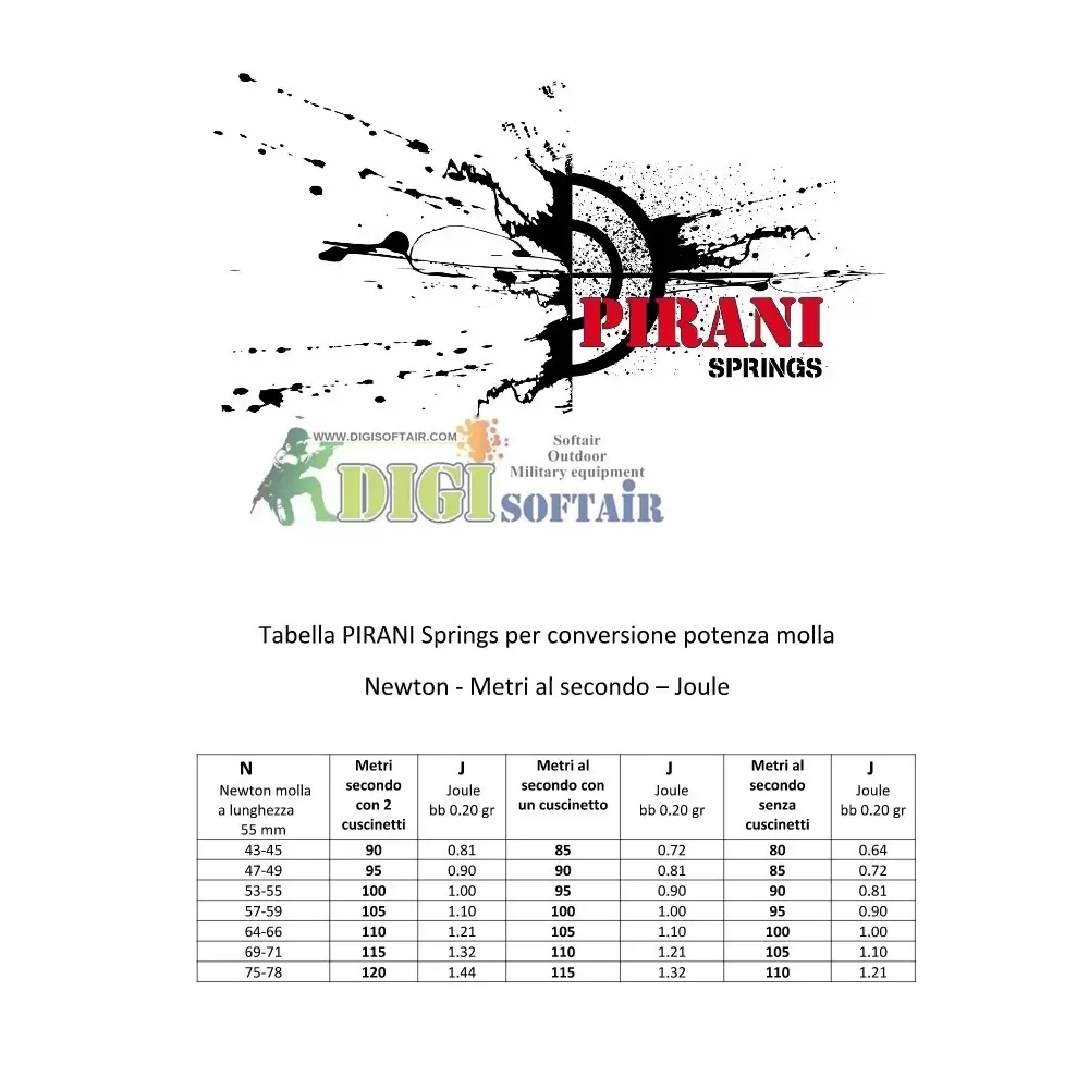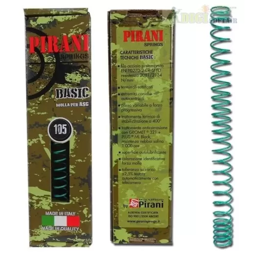 Molle made in Italy, con superficie di appoggio rettificata ed autocentrante, colorazione identificativa forza molla. Trattamento anticorrosione, molla a passo variabile Costruita con acciaio pretemprato. Le molle sono state testate su VFC M4 modiifcato con due cuscinetti, corsa normale, canna da 270mm, hop up scarico e pallini da 0,20gr dando i valori espressi dalla molla