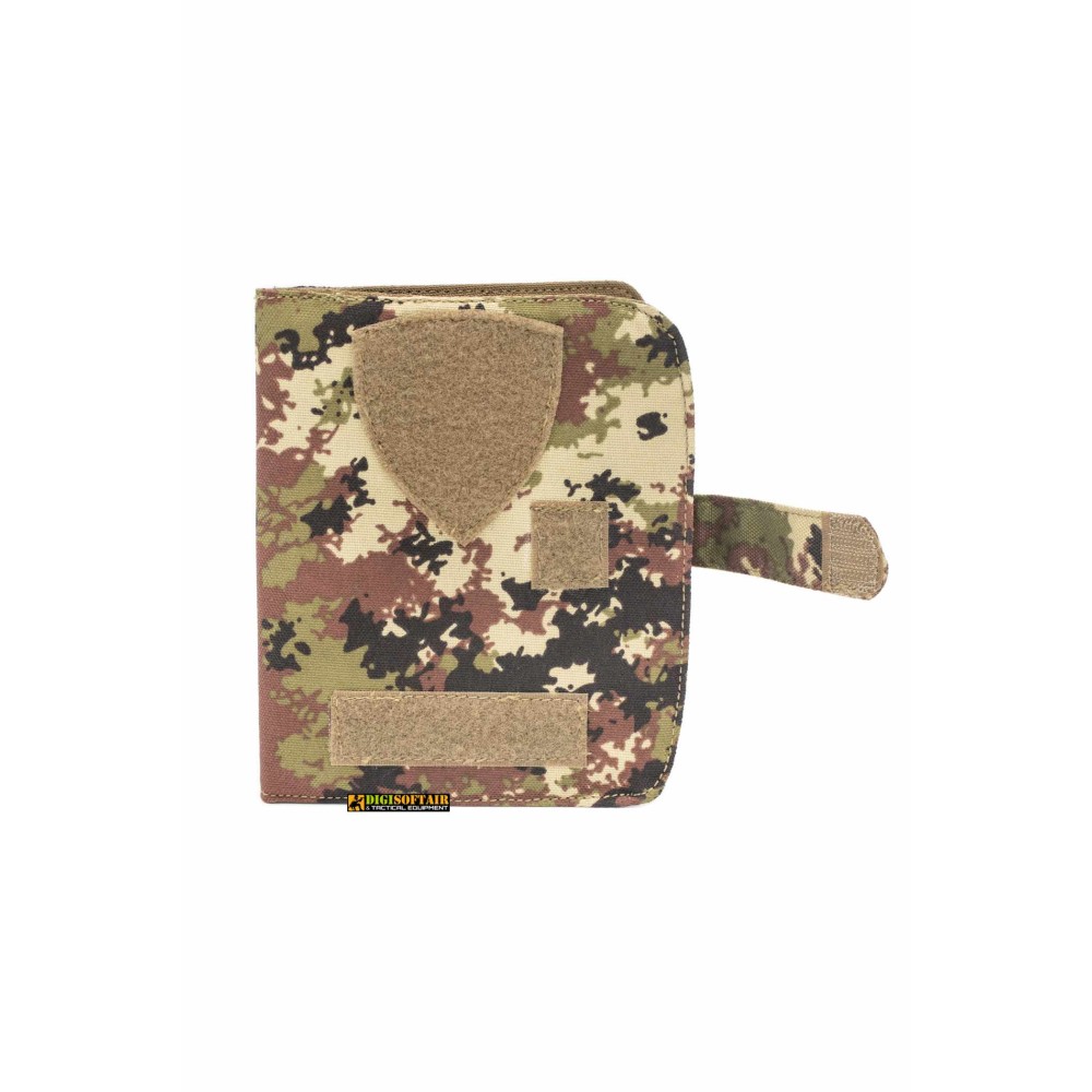 Blocco note tattico Openland in 100% poliestere: chiusura frontale a velcro, velcro esterno per patch e vano interno organizzato con tasche e asole. Compatto da chiuso, ampia superficie di scrittura da aperto.