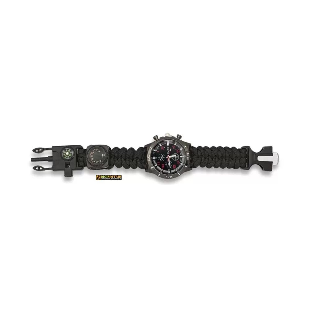 Orologio water resistant con cinturino in paracord, fischietto, bussola e acciarino