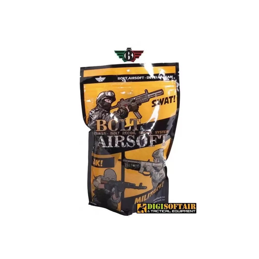 Pallini biodegradabili Bolt 0,32 g in sacco da 1 kg, superficie liscia e tolleranze strette: ottimizzati per repliche bolt, gas e CO2 e per canne di precisione 6,01 mm.