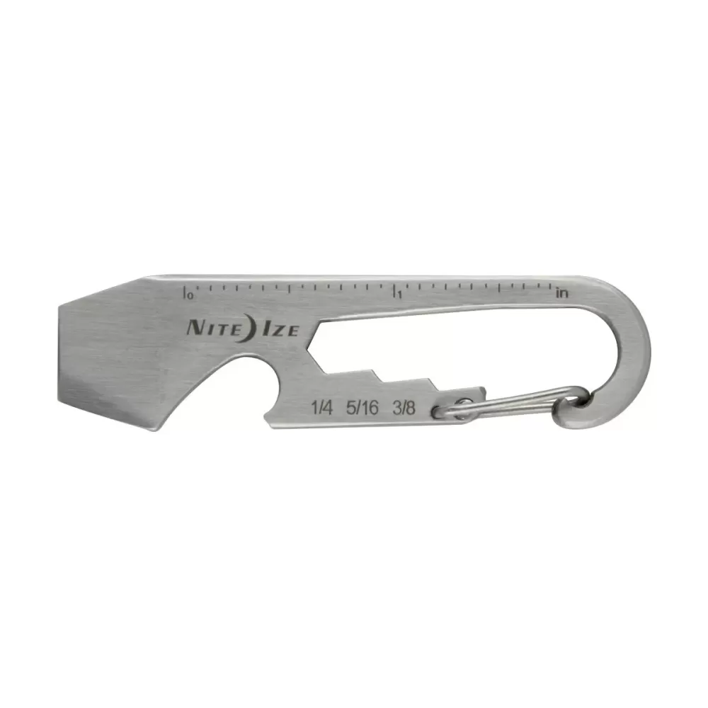 Utensile portachiavi in acciaio inox durevole. Adatto per stringere e avvitare bulloni, aprire bottiglie, dotato di righello in cm e pollici, lama smussata, permette di essere agganciato grazie a un moschettone con funzione anche di chiave inglese.