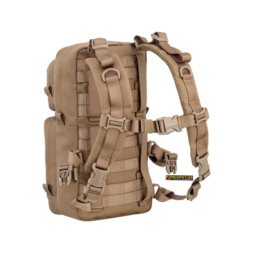 Il sistema MOLLE esterno permette di aggiungere tasche e accessori secondo le necessità operative, mentre i spallacci imbottiti e rimovibili consentono sia il trasporto a zaino sia il montaggio sul retro di altre attrezzature compatibili MOLLE (come gilet o chest rig). La forma ergonomica e le cuciture rinforzate assicurano resistenza e affidabilità, anche con carichi moderati.