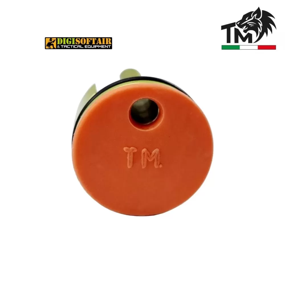 Su questa testa cilindro è pre-montato il PAD ORANGE, ottimale per le molle originali della piattaforma UMAREX/VFC MP7 AEG GEN1/GEN2. La gomma con cui è realizzato il PAD favorisce l’assorbimento degli urti e delle vibrazioni dovute all’impatto del pistone, lo spessore del PAD è progettato per garantire un perfetto A.O.E. (angolo di ingaggio) del pistone sull’ingranaggio settoriale, ed evitare quindi l’utilizzo di spessori sotto la testa pistone (con anche un risparmio di peso e massa battente), il diametro del PAD favorisce e coadiuva la tenuta d’aria sul cilindro, infine la forma innovativa del PAD insieme al cono realizzato sul corpo della testa cilindro, convoglia in maniera ottimale l’aria all’interno del beccuccio allungato della testa cilindro, garantendo una uscita del flusso d’aria più rapida e precisa.
