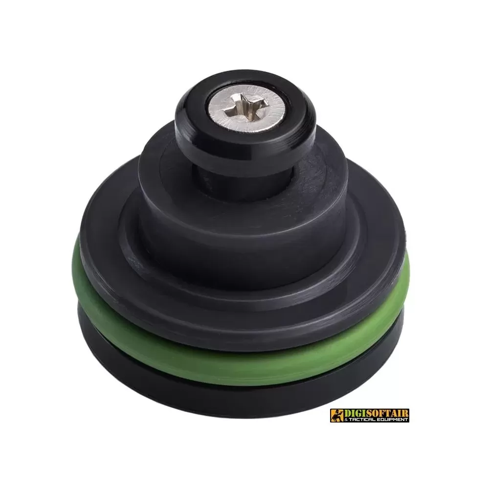 Testa pistone in tecnopolimero caricato con fibra di carbonio, concepita per le raffiche veloci e per aumentare la silenziosità della replica grazie alla ridottissima superficie battente (TPAVPCF).