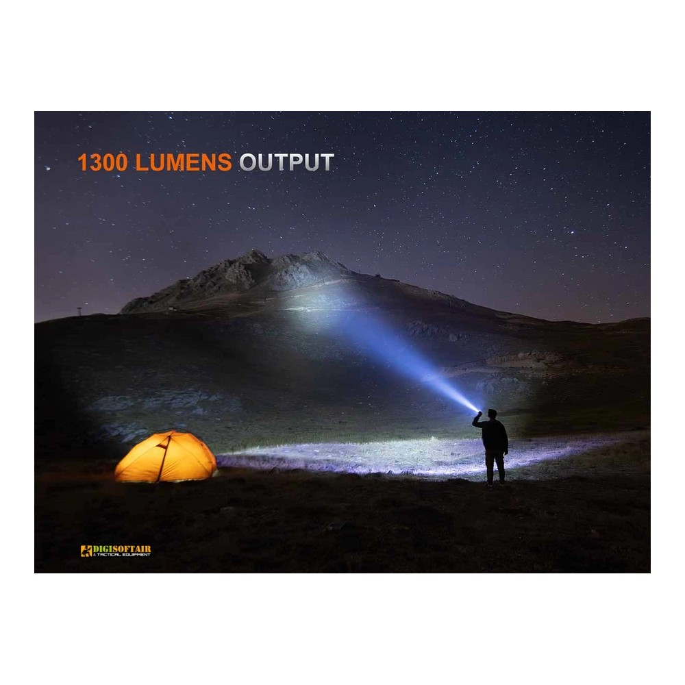 Torcia tascabile ricaricabile compatta e personalizzabile: 1300 lm, portata fino a 354 m, batteria 18350 inclusa e ricarica USB-C. Costruzione in alluminio A6061-T6 con finitura HAIII e protezione IP68.